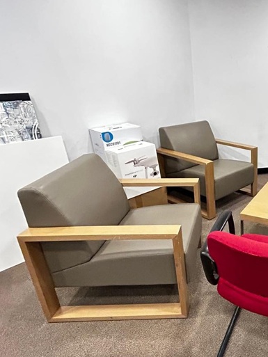 Set of 2 Modern Arm Sofas: Stylish wooden-frame arm sofas with grey cushions ✨Condition: 90% New, well-maintained and clean 🎥Perfect for: interview shoots, reception areas, or office corners. Clean, sturdy, and comfortable – ready to use!
